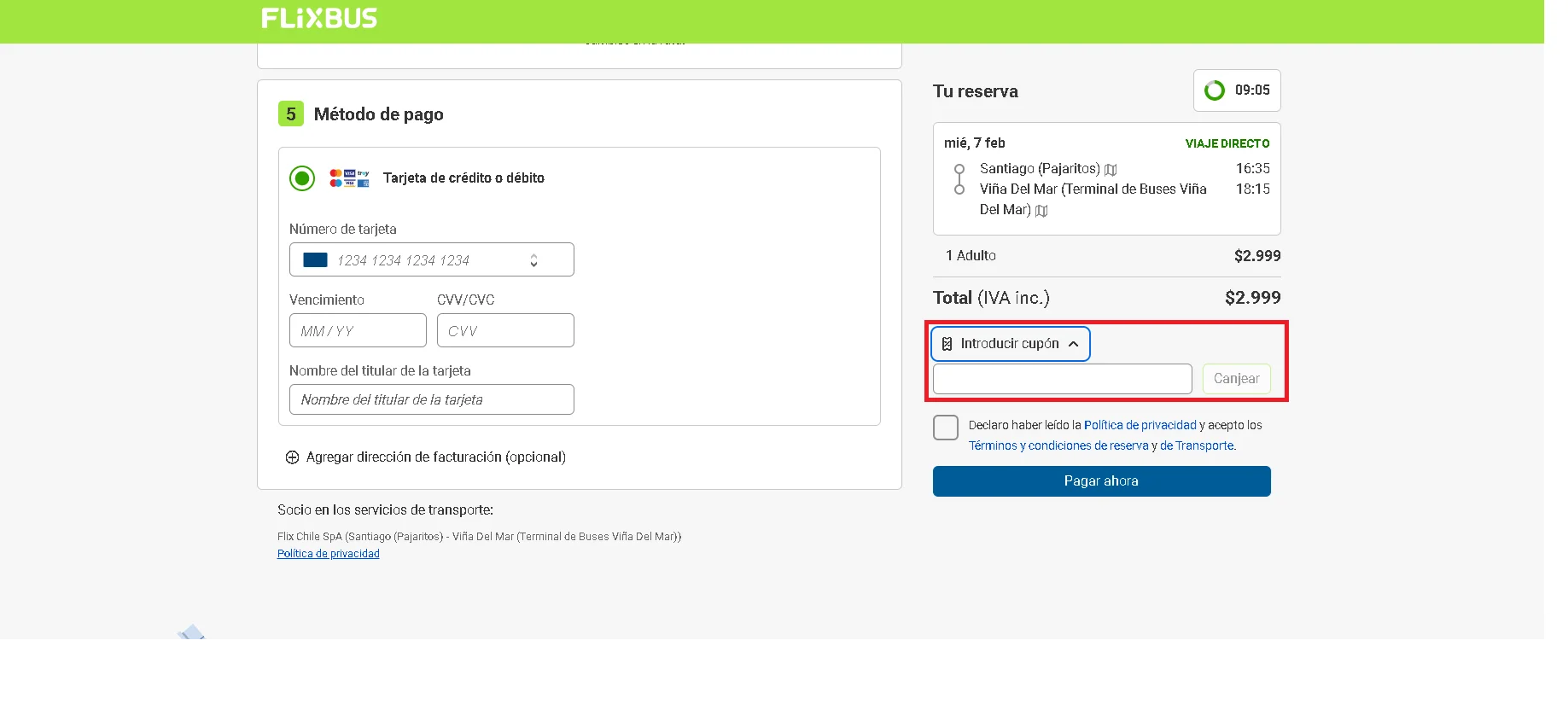 Flixbus es una espectacular plataforma mediante la cual tienes la oportunidad de conseguir lo mejor en lo que se refiere a viajes en bus que hay en Chile. Esta plataforma te conectará con las líneas más confiables de todo el país, de tal manera que siempre encontrarás puntualidad, comodidad y la mejor eficiencia tanto en los puntos de servicio en las terminales como a bordo de los mejores vehículos. Solo tienes que agregar la ciudad que es tu punto de partida, tu punto de destinos, las fechas de salida y regreso y finalmente el número de pasajeros que tomarán el bus. Vas a encontrar una amplia variedad de alternativas de las cuales tienes que escoger la que necesites y prefieras, teniendo en cuentas lo que gustes tus acompañantes y tú mismo. Pagar no será problema con el Cupón Flixbus.